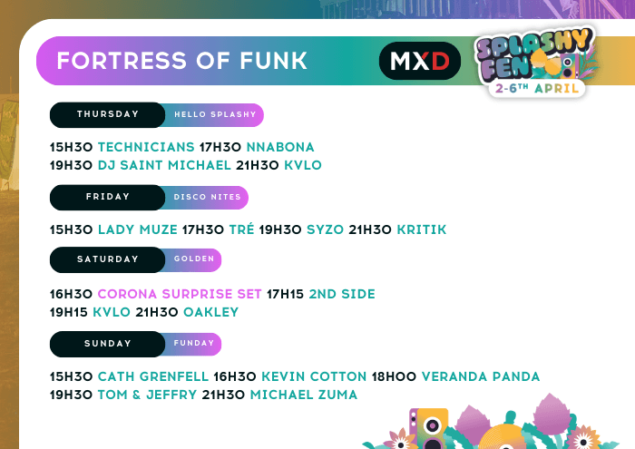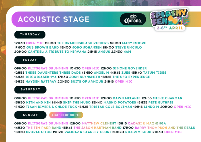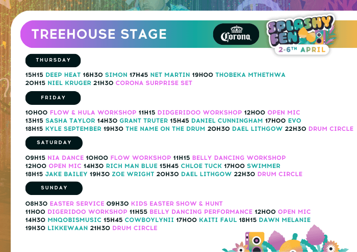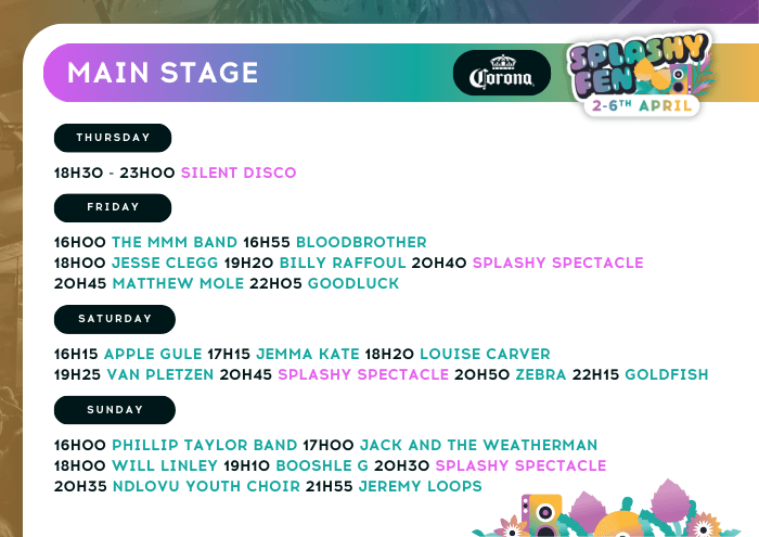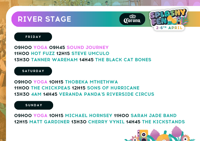 Splashy Fen hosts six unique stages at our festival. These stages are specifically curated to provide festival attendees with a varied, holistic music experience from 10h00 through until 01h00.